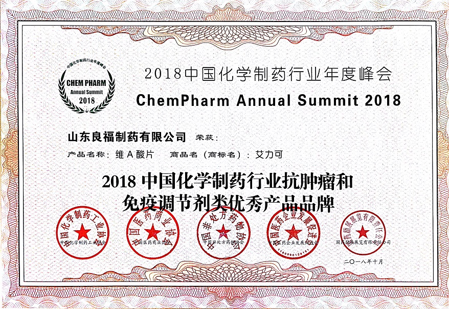10月16日, 2018中国化学制药行业年度峰会在南京隆重举行。会上发布了2018中国化学制药行业优秀企业和优秀产品品牌榜并授牌,良福制药维A酸片『商品名:艾力可』和国内外知名企业的29个产品,一起荣获 “2018中国化学制药行业抗肿瘤和免疫调节剂类优秀产品品牌”。公司董事长刘洪亮先生参加了峰会授牌仪式。