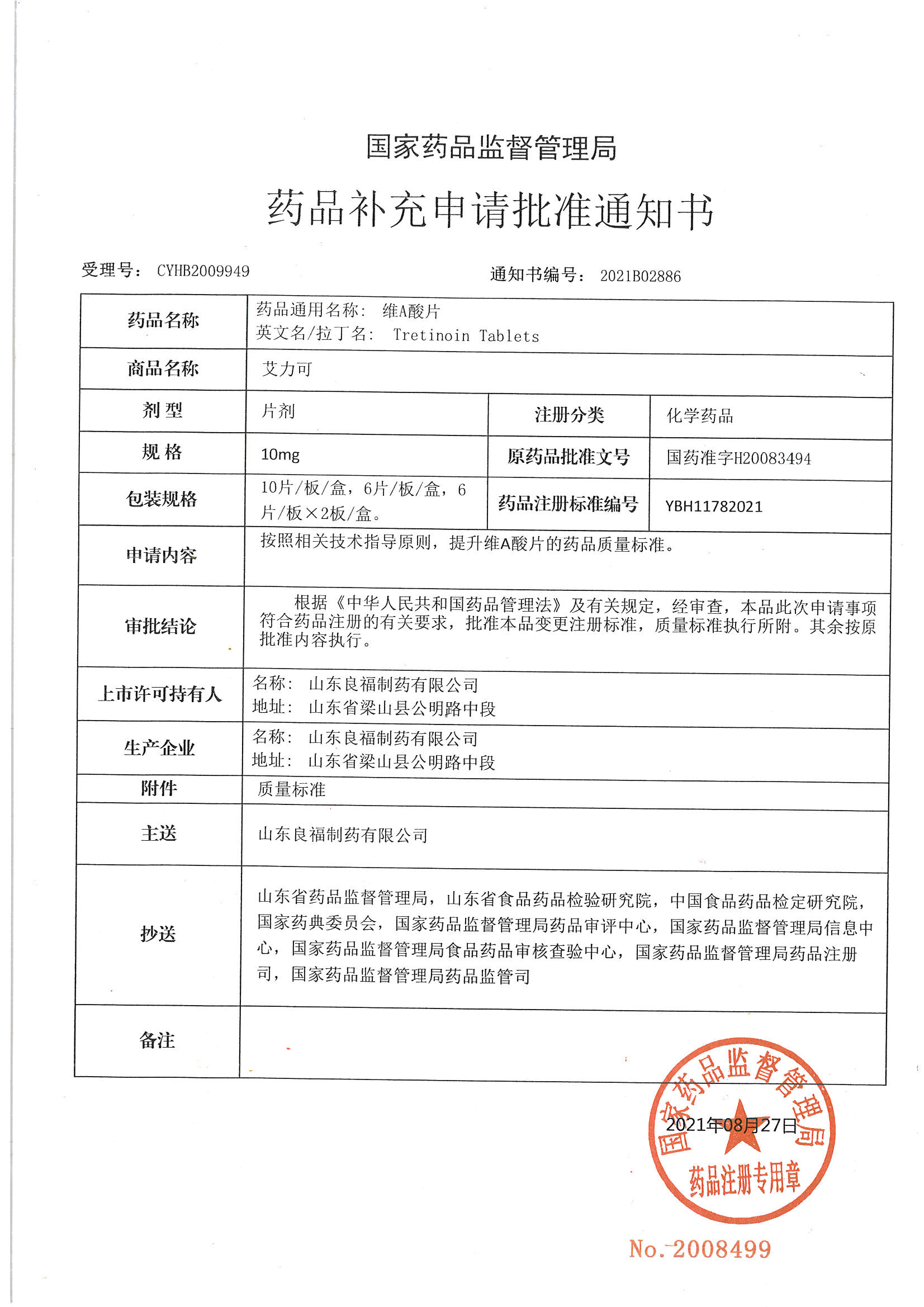 近日,我公司收到国家药品监督管理局核准签发的《药品补充申请批准通知书》,批准公司产品“良福艾力可”维A酸片的药品质量标准提升申请,标志着“良福艾力可”维A酸片的质量再上新台阶,处于世界领先水平!