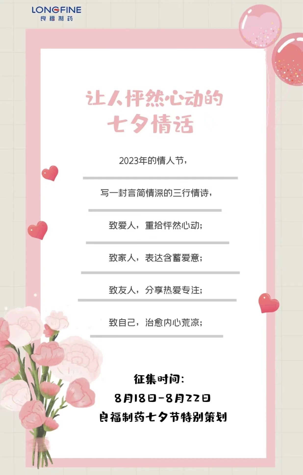 1、参与方式:请将您的“三行情诗”用毛笔或签字笔书写在A3或A4大小的纸上,并拍照/视频上传抖音/朋友圈/快手等发布,标题:#良福制药七夕节特别策划(注意:投稿的作品必须加上#良福制药七夕节特别策划,才能参与评奖哦!)