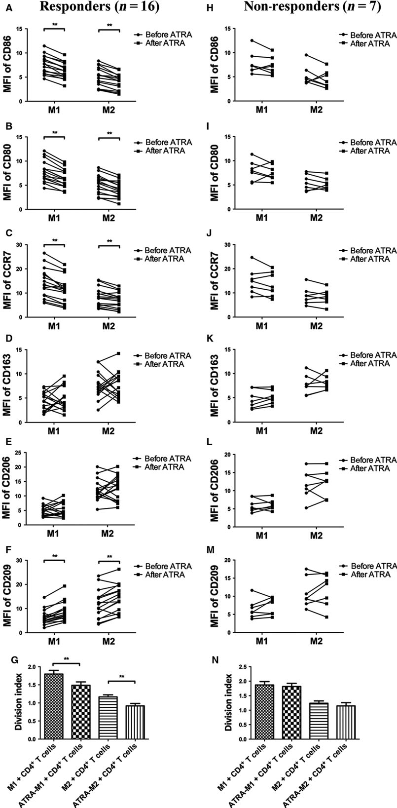 图4.(A-F)ATRA治疗前后CD86、CD80、CCR7、CD163、CD206和CD209的平均荧光强度(G)CD4+T细胞增殖分裂指数