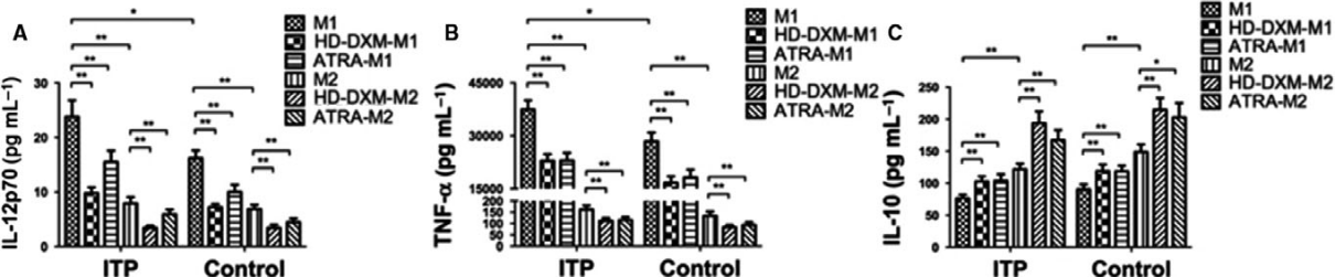 巨噬细胞在适应性免疫和先天性免疫中都发挥了重要作用。在不同的环境刺激下,巨噬细胞分化为典型激活的M1或交替激活的M2表型,具有多种功能。M1巨噬细胞具有促炎作用,而M2巨噬细胞具有免疫抑制作用。M2巨噬细胞的免疫抑制作用是通过增加IL-10的产生,抑制IL-12和TNF-α的分泌,进而影响T细胞的分化和功能。该研究证实巨噬细胞可以直接破坏ITP患者的血小板。ITP患者巨噬细胞的吞噬能力高于健康对照组。HD-DXM或ATRA治疗可使巨噬细胞极化向优势M2表型转移,有利于免疫耐受。对于先前常规治疗无效的患者,ATRA+强的松治疗反应良好。