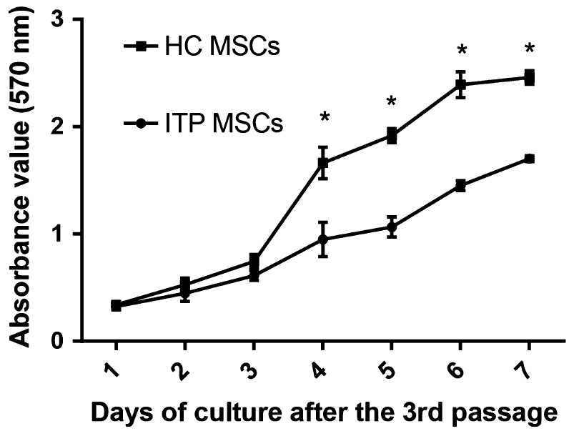 1.ITP-MSCs的增殖能力低于对照组MSCs