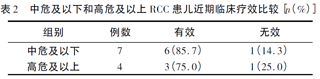 的近期临床疗效为81.82%,中危及以下患儿与高危及以上患儿临床疗效比较差异无统计学意义(P>0.05)。
