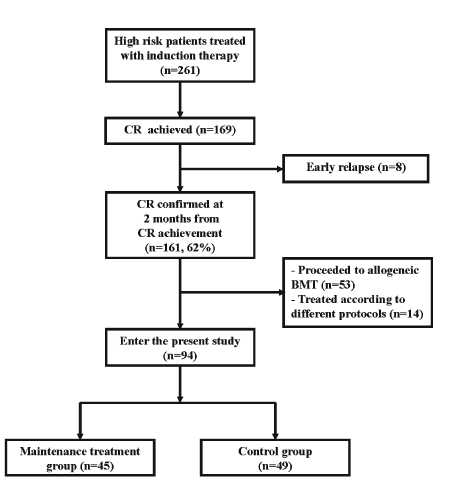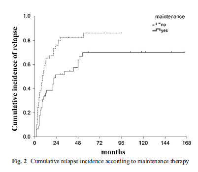 巩固治疗结束后或者获得稳定CR(诱导治疗结束后至少2个月),45例患者接受了维持治疗,49例患者不接受维持治疗。