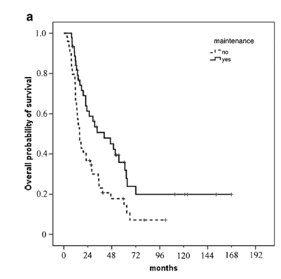 维持治疗组与对照组5年无病生存率分别为21.8 %和 11.5%;中位无病生存时间分别为21.2 月和 8.7月( p=0.017 )